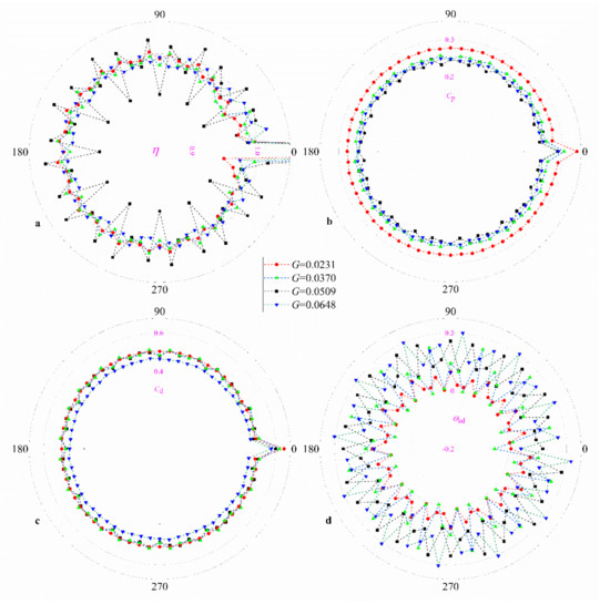 Figure 15d shows the distribution of Θad for each receiver hole with different G. As can be seen from the figure, Θad increases with increases in G. The change in G hardly affects the βp but affects the moment of the stator. When G is small, the velocity gradient of the boundary layer is larger, and therefore the frictional moment is relatively large. The effect of this friction reduces the Θad, making the Θad decrease. Θad,hole_0 is smaller than Θad,hole_i (i ≠ 0), but the reduction rate is significantly influenced by the distribution pattern of the Θad.