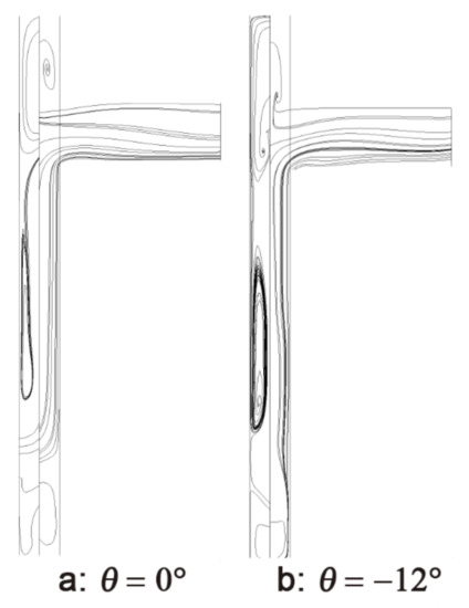 Streamlines at the z-r plane for G = 0.0231: (a) θ = 0°, (b) θ = −12°.