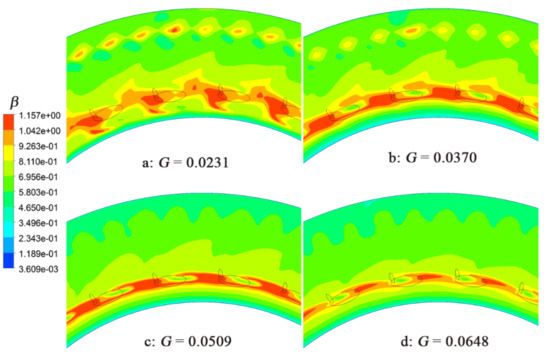 Figure 15c shows the distribution of Cd of each receiver hole with different G. As can be seen from the figure, Cd decreases as G increases. From Figure 19, it can be seen that as G increases, the β decreases, and therefore Cd decreases. In addition, Cd,hole_0 is significantly larger than Cd,hole_i (i ≠ 0), and the increase rate of Cd,hole_0 compared to Cd,hole_i (i ≠ 0) decreases with increases in G. Specifically, Cd,hole_0 increases by 27.5%, 23.2%, 20.1%, and 23.8%, respectively, compared to the average of Cd,hole_i (i ≠ 0) when G is 0.0231, 0.0370, 0.0509, and 0.0648. It can also be seen from Figure 19 that, for larger G, the difference of β between hole_0 and hole_i (i ≠ 0) is small, and therefore the increase rate of Cd,hole_0 is relatively small. Another point worth noting is that Cd fluctuates with a middle G (G = 0.037/0.0509), while it is evenly distributed when G is small or large. This is the same law as the fluctuation in η. When G is in the middle position, the flow structure is relatively unstable, thus causing the fluctuation in Cd to show periodicity.