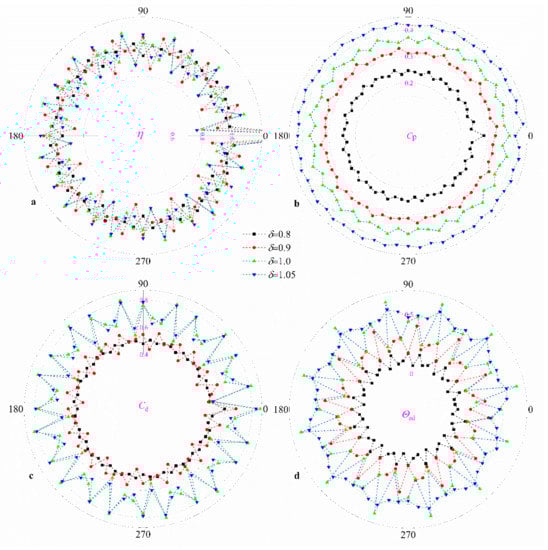 Figure 20d shows the distribution of Θad of each receiver hole for different δ. It is obvious from the figure that Θad increases with increases in δ. The change in the radius position of the nozzle does not affect the velocity of the nozzle outlet, so the tangential velocity of the nozzle outlet is the same. According to the theory of Mahmood [27], the value of the first term of Equation (5) increases with increases in δ, but the moment of stator does not change much. Therefore, as δ increases, Θad increases. Of course, when δ = 1.0, the fluctuation amplitude of Θad is the highest. It is because at this time the distance between the nozzle and the receiver hole is the closest, and the nozzle has the greatest impact on Θad.