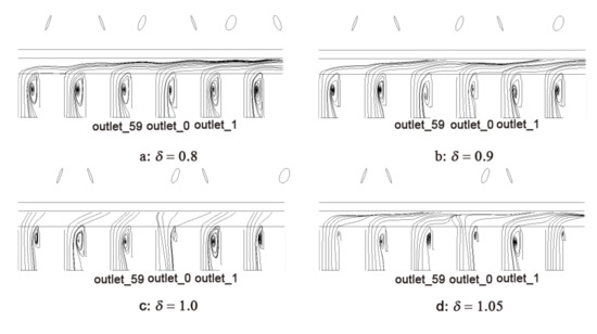 Figure 20a shows the distribution of η for each receiver hole (except hole_0) for different δ. As can be seen from the figure, there are larger fluctuations when δ is closer to 1. This is because, when the difference in radial position between the nozzle and hole is large, the air flows along with the rotor to receiver holes, and the nozzle also has less influence. However, when the radial positions are closed, the air can be injected directly into the receiver holes. It is, therefore, more susceptible to discrete nozzles and exhibits greater fluctuations. The ηhole_0 is 1.536, 1.695, 1.698, and 1.739 when δ is 0.8, 0.9, 1.0, and 1.05, respectively. It can be seen that the increase rate of ηhole_0 compared to ηhole_i (i ≠ 0) increases with increases in δ. Figure 21 shows the streamlines on a cylindrical surface of r* = 0.926, from which it can be seen that, as δ increases, the air can flow directly into hole_0 (this is also supported by the study of Lewis et al. [6]), leading to a greater increase in ηhole_0.