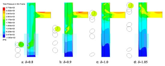 Contour of total pressure in the static frame at plane θ = −12° for different radius ratios of nozzles to holes: (a) δ = 0.8, (b) δ = 0.9, (c) δ = 1.0, (d) δ = 1.05.