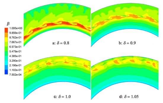 Figure 20c shows the distribution of Cd of each receiver hole for different δ. It is obvious from the figure that Cd increases significantly with increases in δ, and the fluctuation amplitude also increases significantly. From Figure 23, it can be seen that the reason for the increase in Cd is that the β has increased with the increase in δ. The increase in the fluctuation amplitude is because, when δ is larger, the air can be transmitted more directly to the receiver orifice, increasing the fluctuation amplitude. Of course, Cd,hole_0 is larger than Cd,hole_i (i ≠ 0).