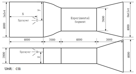 The concentration uniformity is related to the shape, quantity, arrangement, spraying angle, and length of the nozzle. In light of our analysis, we determined that the use of two or three nozzles is sufficient. The nozzle shape can be chosen to have a circular straight channel, or circular expansion, or square expansion. The injection angle, the number of nozzles, and the shape were chosen based on an experiment carried out in the open wind tunnel by the Cold and Arid Regions Research Institute of the Academy of Sciences [4]. The distance from the nozzle to the test section was also determined from that experiment.