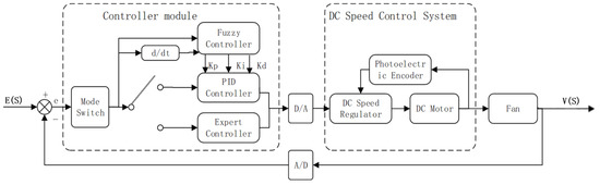 As we can see from Figure 3 showing the fuzzy controller [24], the wind speed can be calculated by Formula (1) after the differential pressure sensor measures the pressure difference . By setting the wind speed to be V0 and the velocity deviation to be e, the deviation change rate can be computed. When using the e and as the inputs, expert control or fuzzy control can be chosen with the mode switch. PID control is chosen when e is greater than the setting value, while expert control is chosen when e is smaller than the setting value [25].