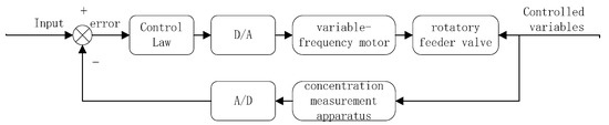 This experiment adopts the PID automatic control scheme of negative feedback. The concentration sensor is the measuring element. The console data acquisition and output value comparison is the comparing element. The rotary valve feeder that controls the sand/dust amount is the controlled object. The dust concentration is the controlled variable, and a change of the wind speed is a disturbance of the concentration. As the executive component, the frequency converter motor controls the rotary feed valve. Figure 3 shows the flow chart of the control system. Figure 4 is the dust concentration feedback control block diagram.