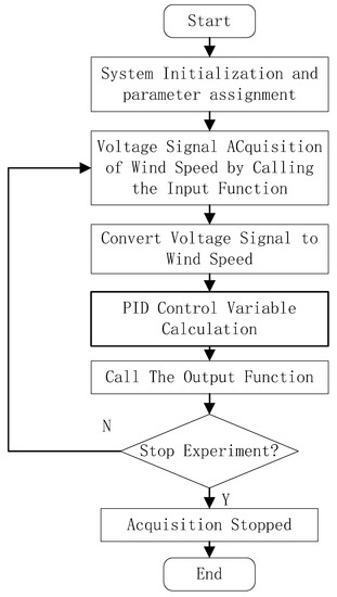 Consider the wind speed parameter as an example. Our experiment involved writing the procedure in the dialog box, adding the hardware drive function, and designing the computer data acquisition and control program—where T is the sampling period in seconds. The flow chart of such a program is shown in Figure 5.