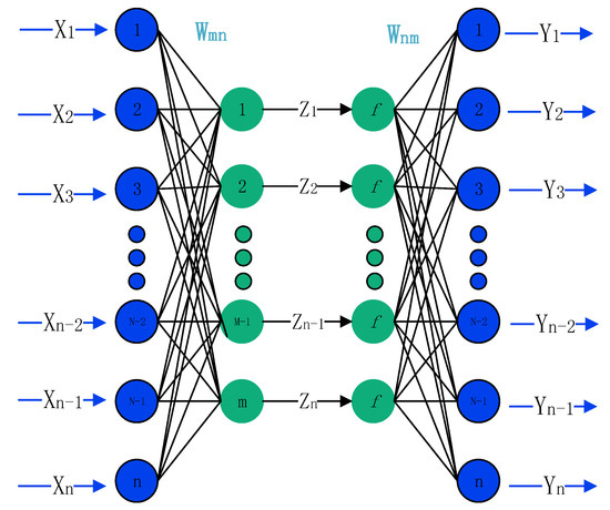 Every autoencoder is composed of an input layer, a hidden layer, and an output layer. The layers are all connected between the neurons of two adjacent layers. However, there is no connection between the neurons of the same layer. As shown in Figure 7, there are n nodes of the input layer and m nodes of the hidden layer. The offset of the ith node of the hidden layer is the connection weights from the jth node of the input layer to the ith node of the hidden layer, which are the connection weights from the ith node of the hidden layer to the jth node of the output layer, and so on. The input is and the output is . The autoencoder consists of two parts, encoding and decoding.