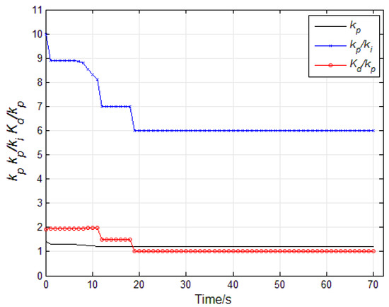 It can be seen that the wind speed variation is basically the same for both control methods at the beginning, because the algorithm has already controlled the motor to reach the maximum power at this time. However, the fuzzy-SAE quickly results in converged wind speed oscillation when the wind speed approaches the target value. Figure 10 shows the variation of the three parameters Ki, Kp, and Kd. Due to the characteristics of the controller and the instrument itself, the three parameters are different, and Ki < Kp, and Kd > Kp. For better presentation, Kp/Ki and Kd/Kp are used to represent the parameter changes.