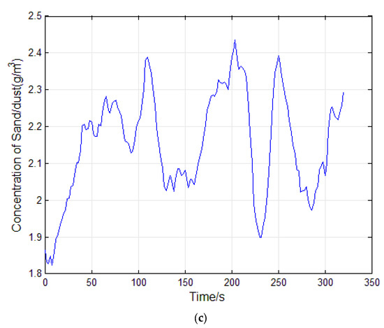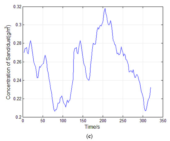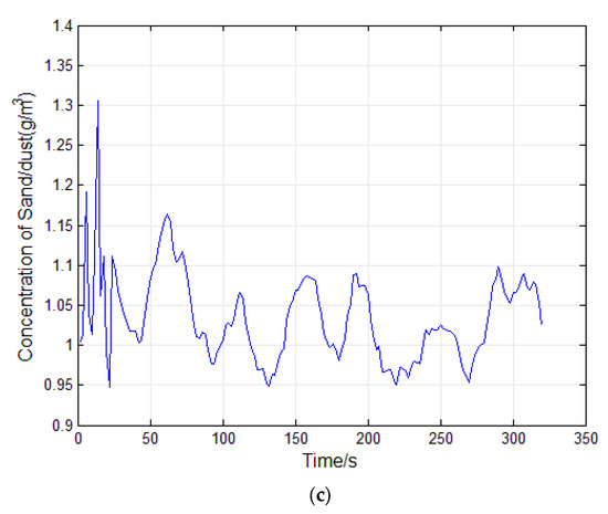 Medium sand concentration data are shown in Figure 13a–c. Especially in Figure 13c, fluctuation in the initial phase of the experiment is significant. The concentration is disturbed when suddenly adding sand and dust into the test tunnel and generally four cycles are required to achieve uniform concentration. Commissioning results of 18 m/s wind speed, high temperature and medium sand is shown in Table 5.
