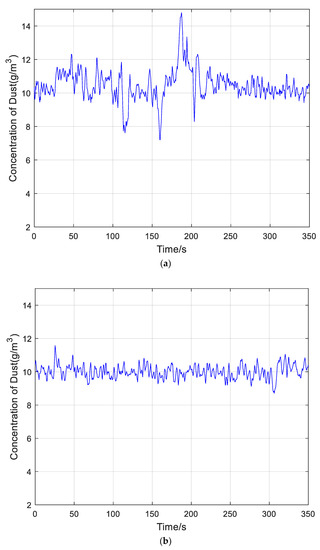 (a) Dust concentration controlled with PID controller; (b) dust concentration controlled with fuzzy-SAE controller.
