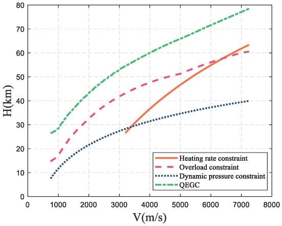 As shown in Figure 1, the upper bound of the corridor on the H–V profile is determined by quasi–equilibrium glide condition (QEGC), while the lower bound is given by the maximum values of dynamic pressure, overload, and heating rate constraints, as indicated in Equation (10).