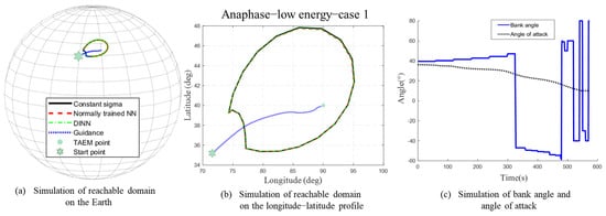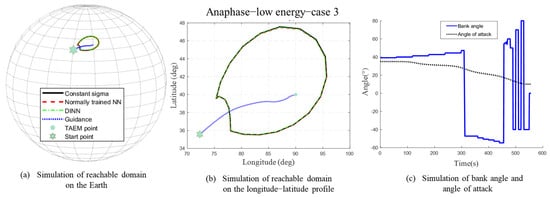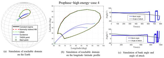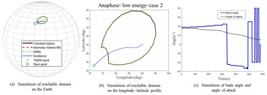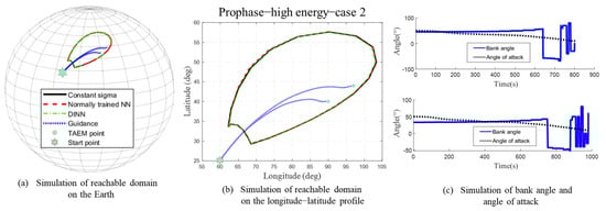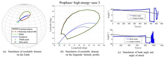 Some primary benefits of DINN may be observed from the above simulation findings. When creating a database, DINN is one–ninth as efficient as BPNN. The constant bank angle method, as the most effective related strategy, still requires 15.84 s and 10.75 s for calculation during the reachable domain generation phase, while DINN needs only 0.019 s and 0.018 s. Since the reachable domains obtained using each approach are nearly identical, the accuracy of DINN is equal to that of the constant bank angle method and BPNN.
