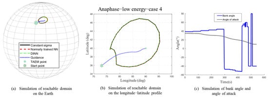 Additionally, feasible trajectories from the initial state point to the TAEM point (90° N, 40° E) were constructed by the guidance algorithm in four low energy cases. Table 10 displays the drop point error for low energy examples 1 to 4. Therefore, the piecewise predictor–corrector algorithm can accurately guide the reentry vehicle to the selected TAEM point.