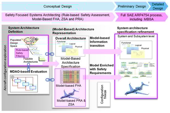 The selection of the system architecture and subsequent analysis during conceptual design leads to an aircraft configuration freeze and is followed by the development of a formal system architecture specification. This specification is the entry point into the formal safety assessment process prescribed by the SAE ARP-4761 standard []. Any safety considerations identified during the formal safety assessment process that require reconfiguration of the architecture or the aircraft configuration will incur high costs and penalties for development time.