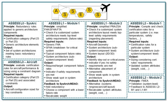 The modules of ASSESS also address the abovementioned research gaps. The ASSESS L0 module implements the rule-based safety assessment whereas ASSESS L1-M1, L1-M2, L2-M1, and L2-M2, help capture the system architecture in an MBSE environment and enable safety analyses such as FHA, PRA, Zonal Safety Assessment (ZSA) and Failure Mode and Effects Analysis (FMEA).