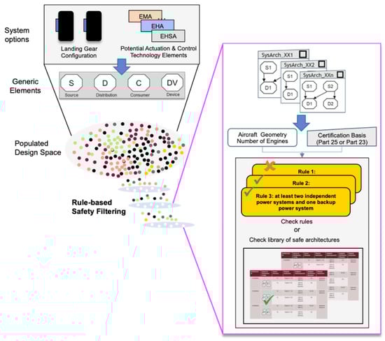 Bussemaker et al. [,,] introduce a design space definition approach using the Architecture Design Space Graph (ADSG), wherein the architecture is modeled as a directed graph with the nodes representing functions or elements of the architecture and the edges between the nodes capturing relationships between elements. In [], the authors introduce a rule-based safety filtering approach for large design spaces as part of their safety-focused systems architecting framework. The rules are classified according to the applicable certification regulation and are synthesized using architecture analysis, certification rule analysis, industry best practices, and existing knowledge bases. They also demonstrate the use of safety rules to build a constrained design space to improve the filtering process.