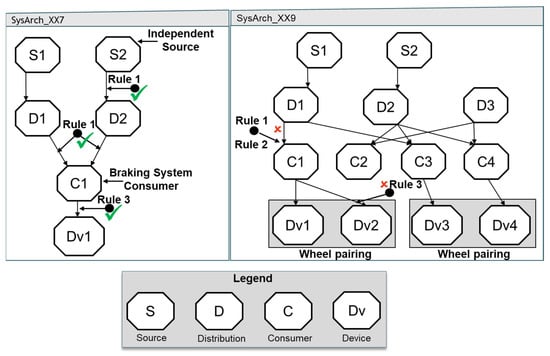 A graph is described as a pairwise relationship between two elements []. A collection of element pairs can be used to describe the interrelationships between components in a system. When used for system architecture description, graphs offer a dynamic representation of the architecture and a multi-level repository for storing architectural information. At the abstract level, a graph can be used to describe relationships between components and capture flows of power, energy, and control within a system architecture. A graph-based descriptor also stores information pertinent to system architecture elements within its nodes and interconnections. Graph elements and interconnections can be queried and evaluated, which makes it suitable for testing safety rules. Staack has presented the use of graph-based model representations to support knowledge-based simulation model development within a conceptual product development framework []. Graph-based descriptors have also been used in other disciplines, such as in cheminformatics, to encode basic chemical information [].