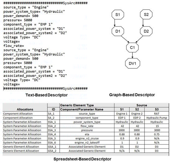 Therefore, by establishing a graph-based architecture descriptor to capture the system architecture input within the framework, the information from diverse sources can be contained within a single entity-which is a key enabler for the integration of the framework’s constituent elements. The graph descriptor can be interfaced with legacy descriptors, such as text-based descriptors that are integrated into MDAO environments or process integration frameworks using custom scripts. More recent information schema, such as CPACS [] and descriptors based on information stored in other formats, can also be interfaced with graph-based descriptors in a similar manner. Finally, the generic element descriptor is extendable to any type of system architecture that features flows of control, power, or energy. The integration of the graph-based descriptor with architecture evaluation in an MDAO environment is discussed in Section 4.