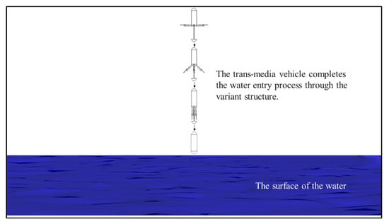 The unsteady water-entry processes of small-sized cylindrical trans-media vehicles, with a characteristic length of 1 m, were investigated by solving the unsteady RANS equations using the VOF method, the dynamic grid method and the 6DOF motion solver. We found that the peak impact load, measured by the peak force exerted by water on the body, strongly depends on four key parameters, including the body mass, the diameter-to-length ratio, the water-entry angle and the head shape. In particular, the peak impact load was found to be approximately proportional to the square of the body mass or the cube of the cylinder diameter. Furthermore, installing an ellipsoidal head can reduce about 94% of the peak impact load experienced by a cylindrical body. Therefore, for practical application, decreasing the body mass, decreasing the diameter, entering the water at an optimum water-entry angle or installing an ellipsoidal head are recommended in order to relieve the peak impact load exerted by water on the body. Note that the current study mainly focuses on the water-entry processes of small-sized trans-media vehicles at a low speed (5 m/s). In some applications, bigger trans-media vehicles are designed to enter the water at a very high speed, thus the fluid compressibility, the cavitation effect and the Reynolds number effect cannot be neglected. In addition, fluid–solid interactions need to be addressed in future studies.