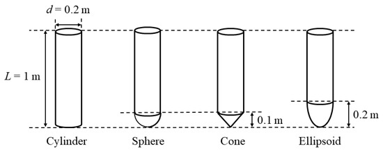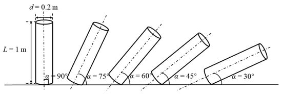 In total, four arrays of computational models were designed for this study. The first array is shown in Figure 2. The cylinder with a length of 1 m and a diameter of 0.2 m was chosen, and its mass was either 15.708 kg, 31.416 kg or 47.124 kg. The second array (shown in Figure 3) consists of three cylinders with the same mass of 31.416 kg. In addition, Model 1 was 1 m in length and 0.2 m in diameter, Model 2 was 0.5 m in length and 0.2 m in diameter and Model 3 was 1 m in length and 0.4 m in diameter. The third array (shown in Figure 4) used the same cylinder with a length of 1 m, a diameter of 0.2 m and a mass of 31.416 kg, and the water-entry angle (α) was set to 30°, 45°, 60°, 75° or 90°. The fourth array is shown in Figure 5. The cylinders with a cylindrical head, a spherical head, a conical head or an ellipsoidal head were studied, and all of them were 1 m in length, 0.2 m in diameter and 31.416 kg in mass.