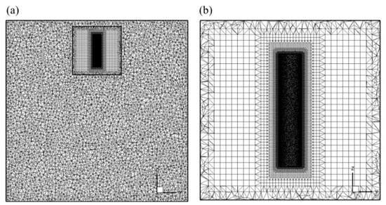 The dynamic grid method, combining the spring-based smoothing algorithm and the mesh reconstruction algorithm, was adopted in the simulations. As shown in Figure 6a, the external flow field, denoted as the overall grid region, adopts the tetrahedral grid cells, due to the fact that the tetrahedral grid cells are more robust in the grid deformation compared with the hexahedral grid cells. As shown in Figure 6b, a square-shaped moving grid region is generated around the cylindrical body, which is dominated by the high-quality hexahedral grid cells for better spatial resolution. In order to accurately capture the water splashing phenomenon around the cylindrical body, the grid cells in the square-shaped moving grid region were specifically refined. In addition, the grid cells in the moving grid region were assumed to be rigid and to have moved together with the cylindrical body.