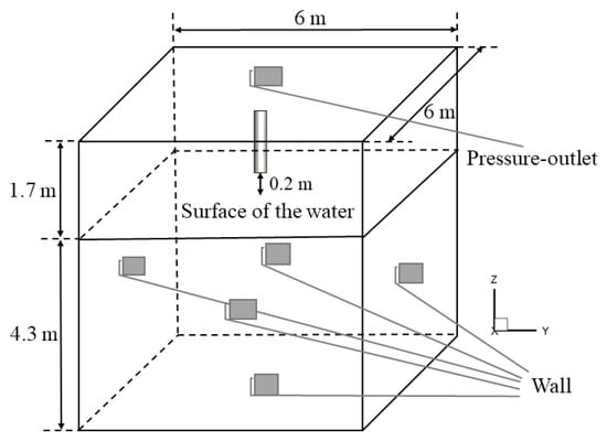 The computational region is a box of 6 m × 6 m × 6 m, as shown in Figure 7. The top surface is defined as the pressure-outlet boundary, and the remaining surfaces are defined as the solid wall boundaries. The initial location of the body’s bottom was set to 0.5 m above the water surface, and the initial velocity was assumed to be 5 m/s. Since the initial pressure field has a great impact on the water-entry process, it was necessary to perform a pretreatment in order to obtain a steady-state flow field as the initial flow field of an unsteady simulation. As shown in Figure 8a, the pressure field under the water was calculated using the following formula: