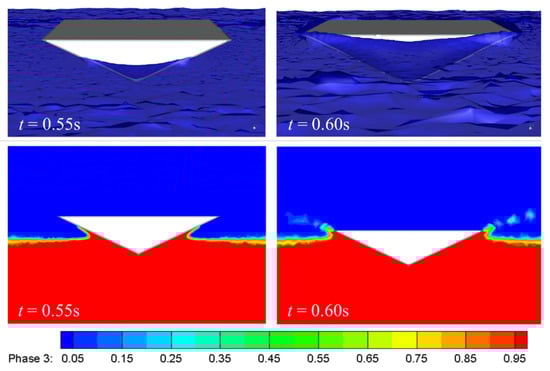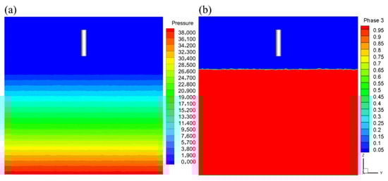 where represents the relative pressure, represents the density of water, represents the acceleration of gravity, represents the depth of the water and the operating pressure is the standard atmospheric pressure of 101,325 Pa. The phase contour is shown in Figure 8b. Note that the volume fraction of air is 0, the volume fraction of water is 1 and the volume fraction in the air–water interface is between 0 and 1.