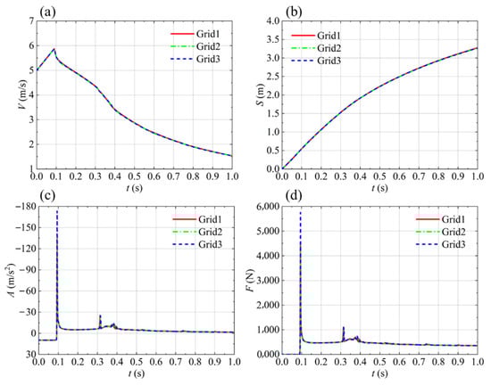 Grid convergence study. (a) Time history of vertical velocity; (b) Time history of vertical acceleration; (c) Time history of vertical displacement; (d) Time history of vertical force.