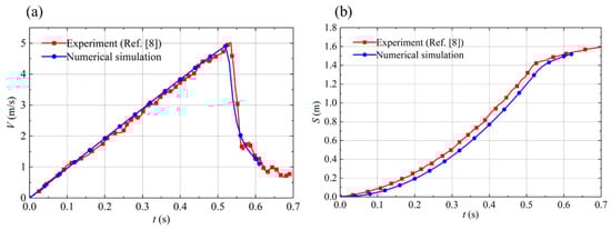 Comparisons between the numerical results and the experimental data. (a) Time history of vertical velocity; (b) Time history of vertical displacement.