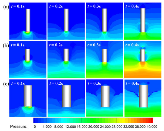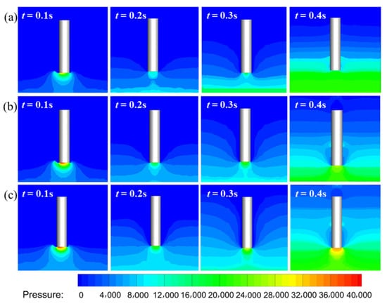 Instantaneous pressure contours of the cylinders with varying masses. (a) M = 15.708 kg; (b) M = 31.416 kg; (c) M = 47.124 kg.