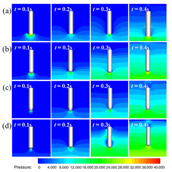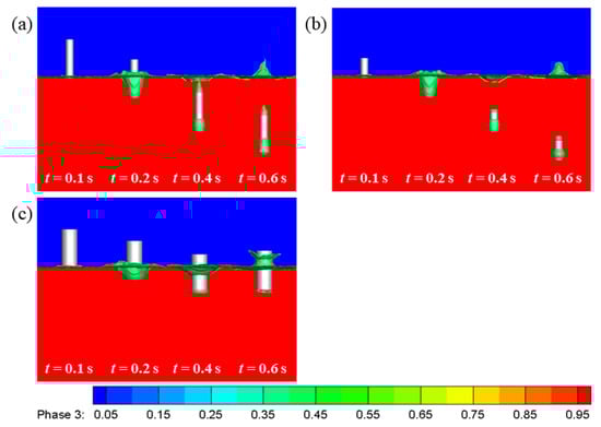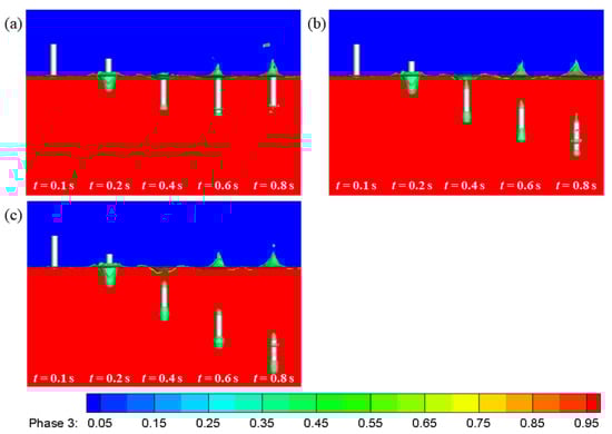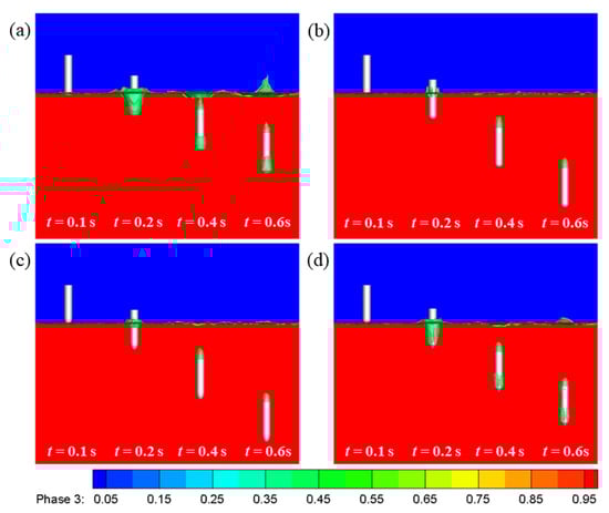 Figure 13 shows the instantaneous pressure contours of the cylinders with varying masses. When the cylinders touched the water surface, the pressure at their bottoms increased dramatically. After entering the water, the bottom pressure gradually decreased. In addition, the peak value of the bottom pressure was directly related to the body mass. As the mass increased, the bottom pressure also increased. Thus, it can be inferred that decreasing the mass can decrease the impact force. The instantaneous phase contours of the cylinders are shown in Figure 14. As expected, the cylinder with more mass fell faster under the water. Additionally, when the cylinders approached the water surface, they captured some air beneath them. In the figure, it is clear that some air was trapped beneath these cylinders, and the volume of the air trapped by the cylinder increased as the mass increased.