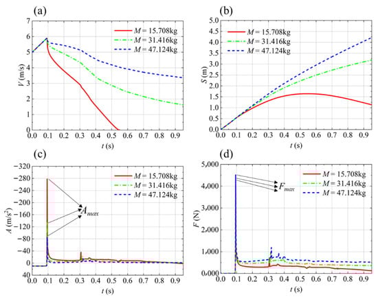 Comparisons between the time histories of the cylinders with varying masses. (a) Vertical velocity; (b) Vertical displacement; (c) Vertical acceleration; (d) Vertical force.