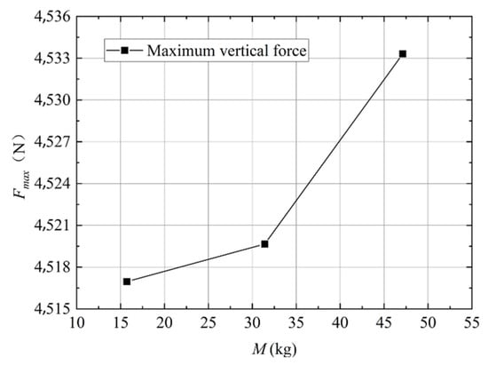 Figure 15 shows the time histories of the vertical velocity, the vertical displacement, the vertical acceleration and the vertical force. From the figure, it can be seen that before t = 0.094 s, the vertical acceleration of these cylinders was equal to the acceleration of gravity, and the vertical force exerted by the air was negligible. At t = 0.094 s, the cylinders began to touch the water surface and the vertical force exerted by water increased suddenly, confirming the observations in Figure 13. This peak impact load was the major reason for the damage that the vehicle structure sustained. A second peak impact load can be seen at the moment that the body completely fell into the water. However, compared with the first peak impact load, the second peak impact load was almost negligible. Further examination of the first peak load is presented in Figure 16. It was estimated that the peak load was approximately proportional to the square of the body mass. Thus, decreasing the mass of the body is an effective way to reduce the impact load. However, this may not be very practical due to the load-carrying requirements, so other methods of reducing the impact load have to be pursued as well.