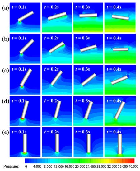 Instantaneous pressure contours of the cylinders with varying water-entry angles. (a) α = 30°; (b) α = 45°; (c) α = 60°; (d) α = 75°; (e) α = 90°.