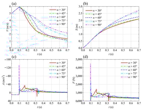 Figure 20 shows the instantaneous pressure contours of the cylinders with varying water-entry angles. As expected, it can be seen that the peak pressure on the body decreased as the water-entry angle decreased. This is because a lower water-entry angle has increased the wettened area, and therefore has relieved the peak impact load. This observation was confirmed by further examination, as seen in Figure 21. It can be seen that the peak impact load at an angle of 90° was about 4.5 times larger than that at an angle of 60°. However, as shown in Figure 21d, the cylinder entering the water at a small water-entry angle experienced a bumpy force, which is unfavorable in some applications. Note that although a higher water-entry angle resulted in a higher peak load, the cylinder with a higher water-entry angle reached the target location at a faster speed, as shown in Figure 22. Depending on the requirements of the mission, an optimum water-entry angle should be pursued in practical applications.
