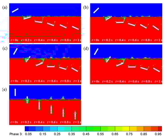 In order to study the effect of the water-entry angle on the water-entry process, five water-entry angles (30°, 45°, 60°, 75° and 90°) were chosen, as shown in Figure 4. The inertia tensor of the cylinders is shown in Table 5, and the initial conditions were the same as those in the previous section.