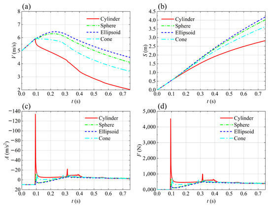 In this section, the effect of head shape on the water-entry process is studied. The geometries of the chosen head shapes are shown in Figure 5. The inertia tensor of the cylindrical bodies is shown in Table 6, and the initial conditions were the same as those in the previous section.