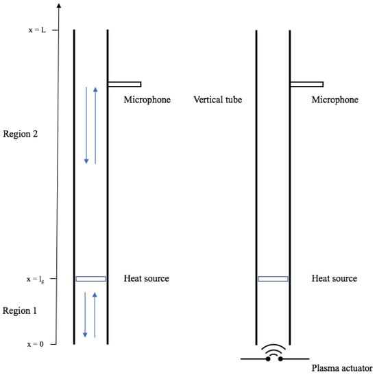 As shown in Figure 1, the entire Rijke tube is divided into two regions: region 1 from the inlet to the heat source () and region 2 from the heat source to the outlet (). The acoustic waves travel along the tube, and the fluctuations of pressure and velocity in the tube can be expressed by the following equation: