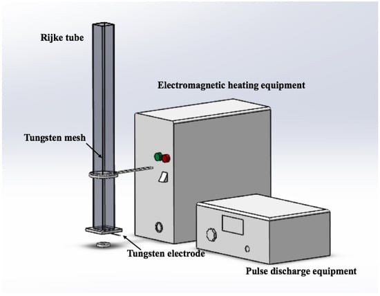 The schematic drawing of the Rijke tube THA oscillation system and the control device we built is shown in Figure 2. The Rijke tube was vertically placed, and a quadrate tube with a size of 55 mm × 55 mm × 800 mm was used in experiments. The heat source used was a tungsten mesh that was inductively heated by an electromagnetic (EM) heating device. The maximum power of the EM heating device was 2 kW, which was enough to stimulate the THA oscillations. The purpose of the study is to establish if the discharge can suppress THA oscillations in a Rijke tube; thus, one of the important parameter of the Rijke tube THA oscillation system, the heat source locaition, is kept fixed near the location , where the most favourable position for the excitation of THA oscillations is.