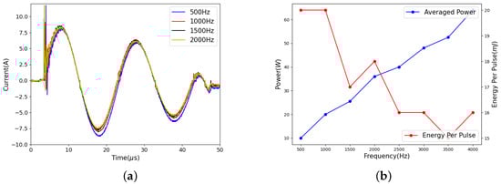 (a) Current waveform; (b) average power and energy per pulse at different discharge frequencies.