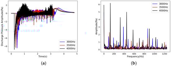 (a) Pressure perturbation waveform and (b) FFT results at different discharge frequencies.