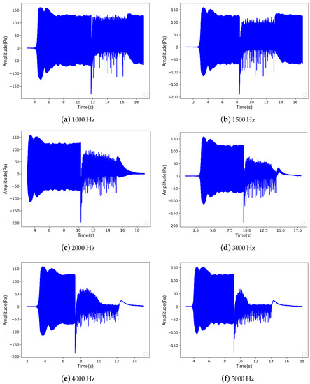 Yvonne Sutton [35] studied the plasma acoustic in her PHD work, and it was revealed that the sound pressure level increases when the electrode spacing becomes larger. Here, we searched for a suitable electrode spacing and kept it constant. In our experiment, electrodes were set at the inlet of the Rijke tube so that the microphone needed to be placed inside the tube during the measurement, and the acoustic perturbation of the discharge propagating along the tube was obtained. The typical pressure perturbation waveforms at different discharge frequencies were measured, analyzed using fast Fourier transform, and compared, and the results are shown in Figure 5. It can be seen that (1) the amplitude of the pressure perturbation did not vary significantly with the discharge frequency; (2) after the FFT analysis, the oscillations of higher harmonic frequencies were excited; and (3) the amplitudes at a high frequency band of 4000 Hz discharge were much bigger than others. Actually, we think that its acoustic characteristics have a strong relationship with the plasma arc stability itself because the arc might go to an instable state, with the discharge frequency increasing.