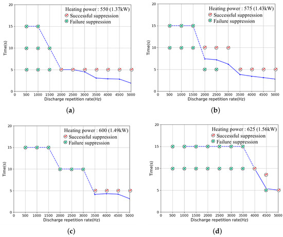 The results of all the experimental groups (variable heating power) are represented in the Figure 8. The time it took to suppress THA oscillations at different discharge frequencies was recorded as a judgment of effectiveness. The symbols on the grid nodes represent the success or failure of this experiment, and the points outside the grid nodes represent the actual time spent of the successful control. It is clearer: (1) only if the discharge were applied with sufficient high-repetition frequency and enough operation time could it mitigate THA oscillations in the Rijke tube; (2) with the heating power increased, the discharge frequency needed to suppress THA oscillations became higher; and (3) the dicharge with higher repetition frequency needed less time to suppress the oscillations, i.e., to be more effective.