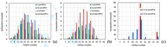 Hydrocarbon distribution plots of selected Category A and Category C jet fuels: (a) A2 or Jet A, (b) A3 or JP5, and (c) C1 and C4. Data extracted from [].