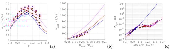 (a) Laminar flame speed (), (b) extinction strain rate (), and (c) ignition delay time () for n-dodecane (