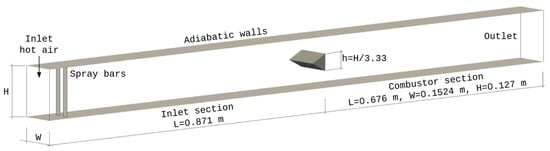 The first combustor configuration considered here is the equilateral triangular bluff-body combustor of Air Force Research Laboratory, Wright-Patterson Air Force Base [], presented in Figure 3. During operation, electrically heated air passes a vitiator dome, a single-stage radial cyclone swirl combustor, and a mixing cone to promote uniform temperature across the critical plate, being the inlet section for the simulations, acoustically isolating the test section from the upstream supply section. Downstream of the critical plate, the hot air passes around the fuel spray bars, each with nine injection orifices, into the flow development section, where boundary layer and turbulence effects are used to produce a fully developed premixed flow at the test section inlet. The test section is of rectilinear shape, with a cross-section of 152.4 × 127.2 mm2. The bluff body is a solid mm equilateral triangle, and the test section exit is open to the atmosphere. High-frequency pressure transducers mounted along the streamwise and transverse directions and high-speed OH* chemiluminescence is performed to characterize the flame.