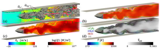 Instantaneous perspective views from the side of the reacting flow in the AFRL equilateral triangular bluff-body combustor in terms of (a) volume renderings of the axial velocity, , and an iso-surface of the second invariant of the velocity gradient tensor, , (b) temperature, , (c) heat release, , and (d) mass fractions, , of i-C4H8, CH2O, HCO, and OH for C1.