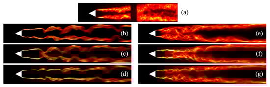 OH* chemiluminescence images from (a) experiments with n-dodecane, and from flamelet LES, using the FSD model of Weller et al. [] of (b) n-dodecane, (c) Jet A, and (d) C1, and from LES-LDKM-EDC model of (e) n-dodecane, (f) Jet A, and (g) C1 at .