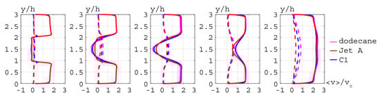 Figure 6 shows comparisons of the time-averaged axial velocity, , and axial velocity fluctuation, , profiles along the vertical direction, , at , 0.95, 1.53, 3.75, and 9.40, normalized with the inflow velocity, , from the LES-LDKM-EDC simulations of n-dodecane, Jet A, and C1 at an equivalence ratio of . Regarding , we find that, at , where refers to the axial co-ordinate, all fuels show U-shaped profiles. At , n-dodecane and C1 show V-shaped profiles, whereas Jet A still shows a U-shaped profile. At the end of the recirculation zone, at , all fuels behave similarly, showing V-shaped profiles. In the recovery region, represented by the profile at , Jet A shows the slowest recovery. In the fully developed turbulent combustion region, represented by the profile at , all fuels tend to predict almost flat profiles. Regarding , we find that the profile shapes are similar, with the highest fluctuation levels initially occurring in the shear layers, then transitioning towards the center of the duct at the end of the recirculation zone, and, finally, to spread out across the duct in the fully developed turbulent combustion region, where is highest for n-dodecane followed by C1 and Jet A.